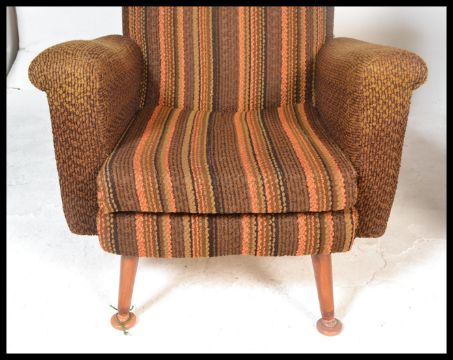 A pair of 20th Century vintage / retro fireside easy lounger armchairs being upholstered in wool with shaped armrests, all raised on tapering supports. Measures 90cm high x 76cm wide x 80cm depth