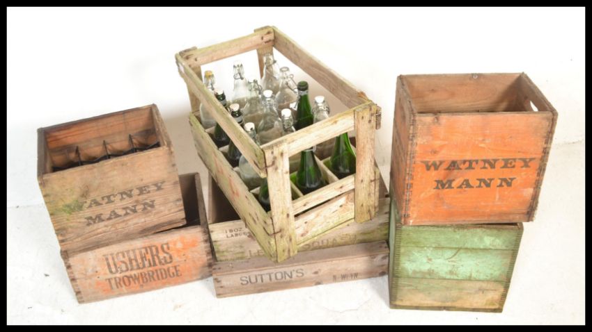 A collection of vintage 20th Century advertising bottle crates, crates to include Watneys, Kio Ora etc.
