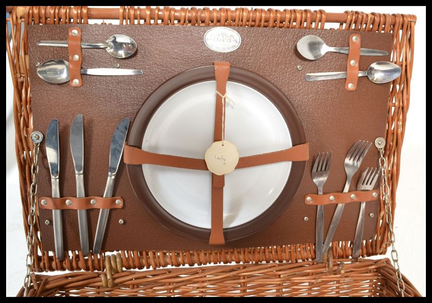 A vintage 20th Century vinyl cased Brexton picnic hamper set, all original contents within to include two flasks, four teacups and saucers, cutlery etc contained within a wicker hamper. Measures 20cm high x 55cm width x 37cm deep.