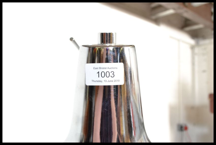A large retro style floor standing chrome anglepoise lamp, raised on a large circular base with adjustable sprung uprights terminating with a large chrome pendant shade. Measures 103Hcm