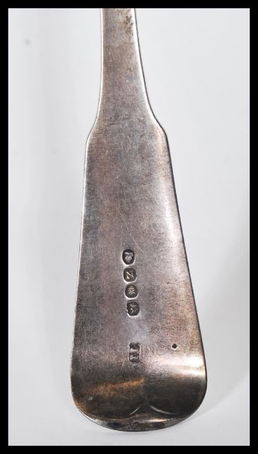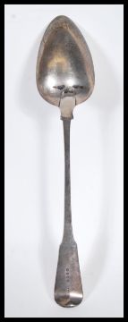 A 19th Century Georgian John Lias silver hallmarked serving spoon having an engraved crest to the handle. Hallmarked London 1808. Weight 144g.