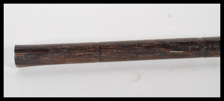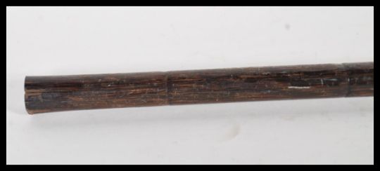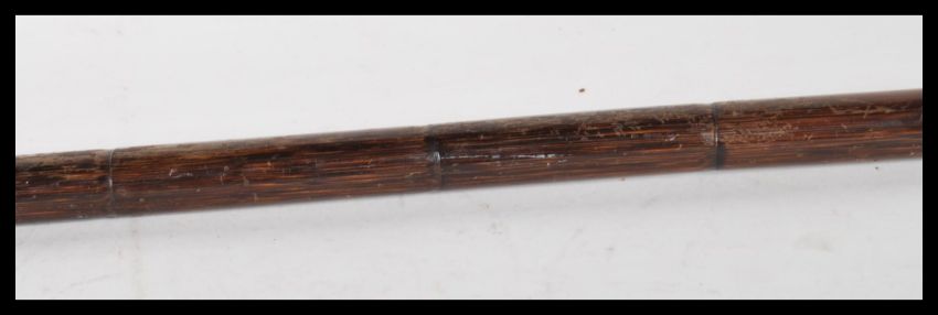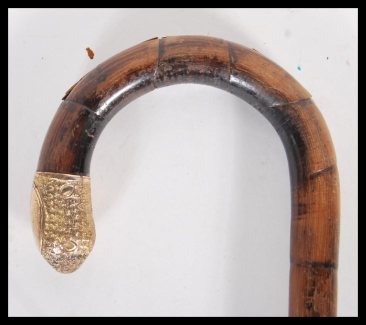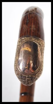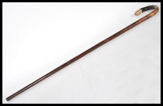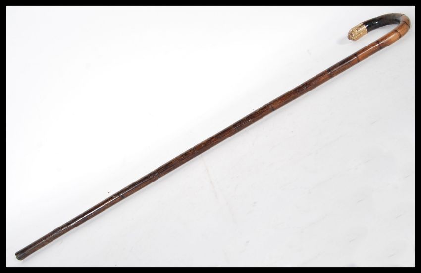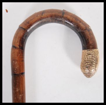 A 20th Century walking stick cane having crook handle with gold plated tip with plain armorial cartouche, on tapering bamboo shaft.Measures 85cm wide.
