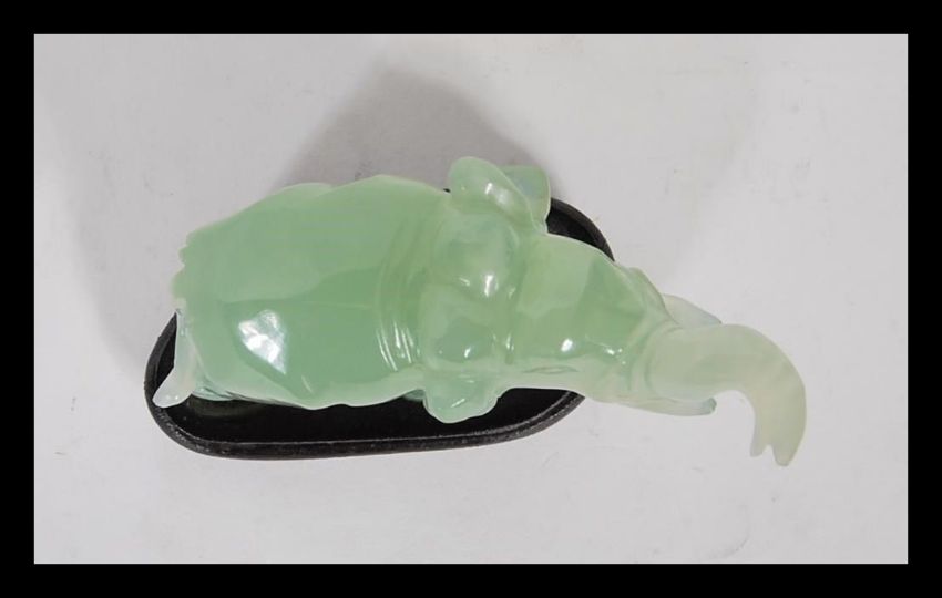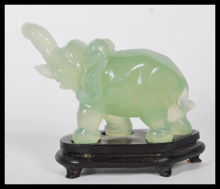A 20th Century Chinese carved jadeite elephant on all four legs raised on a ebonised wooden base.Measures 10cm wide.