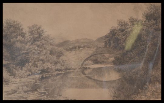 Daniel Law (1831 - 1902) - Two 19th Century etchings on paper to include 'Brig O' Turk' depicting a stone bridge over a Scottish river along with another a French river scene with a Cathedral to the background. Both signed in pencil to the corners. Framed and glazed. Measures 60cm high x 70cm wide.