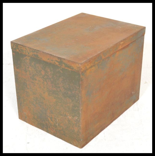A vintage early 20th Century Industrial four drawer desk top filing cabinet, each drawer fitted with pull handle and name card with remnants of numbers to the front. Measures 30cms x 29cms x 39cms.