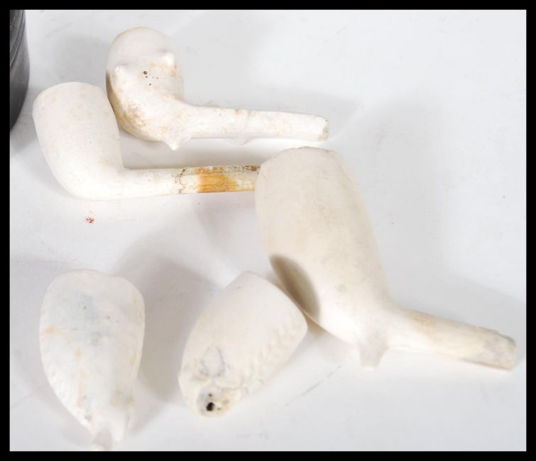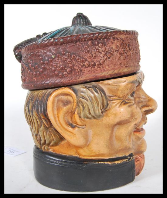A early 20th Century Austrian ceramic tobacco jar in the form of a male head wearing a hat with tassels a top, being hand painted. Together with a small group of clay pipes some having carved decoration and others plain.Measures 16cm x 14cm.