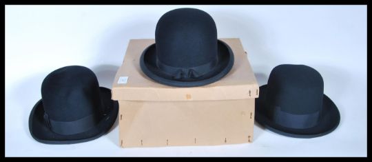 A group of three vintage 20th Century black moleskin bowler hats made by Griffson, Borsalino and Brummell.