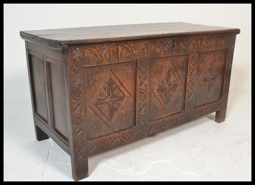 A 17th / 18th century country oak large coffer chest. Raised on stile legs with wide and deep body having inset fielded panels with carved diamond lozenge detailing. Hinged top above. Measures 68cm high x 127cm wide x 56cm depth