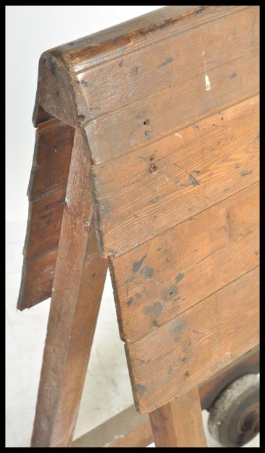 An early 20th century industrial factory wooden saddle / leather factory trolley removed from a factory in Northampton. Originally used to move drying leathers and saddles around the factory.The trolley being of simple wooden construction with wooden beam atop forming a triangular structure metal trolley wheels with a slatted wooden top. . Measures 175 cm high x 74 cm wide x 40 cm deep.