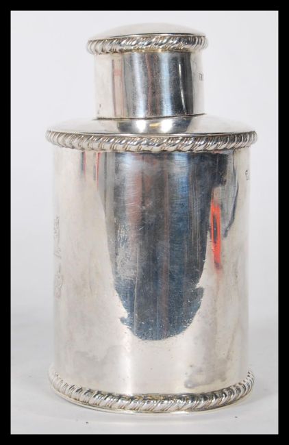 A 19th Century Victorian silver hallmarked tea caddy having gadrooned bordered having engraved dragon decoration to the front reading 'pro deo et patria'. Hallmarked Sheffield 1894. Weight 135.9g.