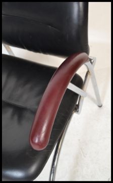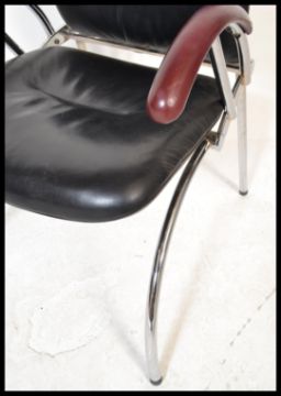 A superb pair of 20th century retro vintage Bauhaus / Thonet inspired designer armchairs comprising of a heavy steel and chrome plated frame with padded backrest, seat and armrests upholstered in a top grain leather. The chairs frame having angular and sweeping form. Measures 84cm high x 65cm wide x 60cm depth.
