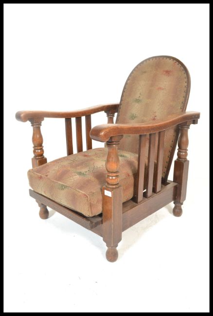 A 1930's Art Deco oak framed fireside reclining armchair. The chair with upholstered seat and back cushions with shaped elbow rests with slatted sides raised on turned feet. Measures 93cm high x 63cm wide x 83cm depth.