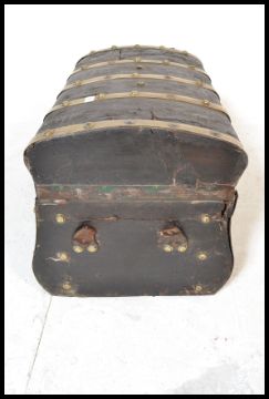 An 18th century black leather and brass bound dome top travelling trunk, leather handles to sides with clasp and lock to front. Measures 46cm high x 72cm wide x 42cm depth.