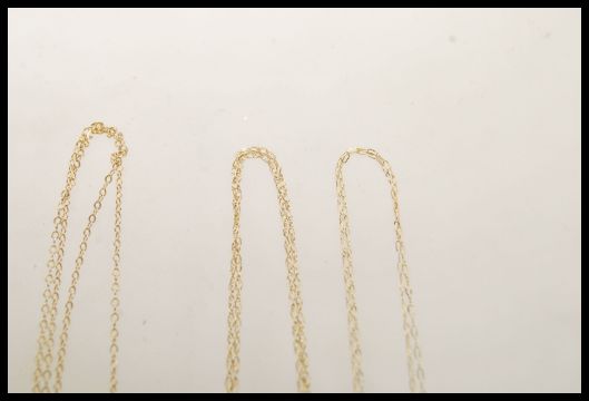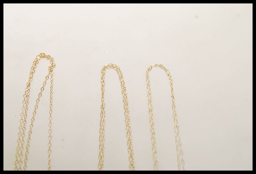 A group of four stamped 9ct gold necklace chains having spring ring clasps to include oval link and fine necklace chains. Total weight 2.7g. Longest measures 21 inches.