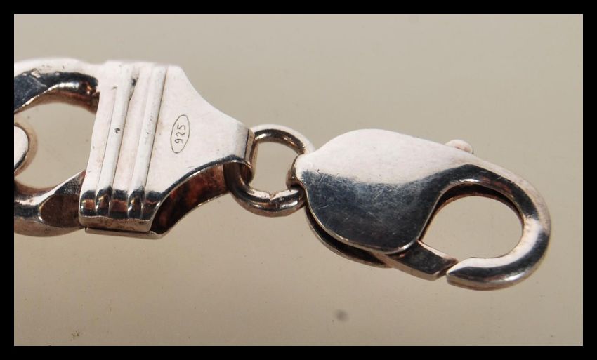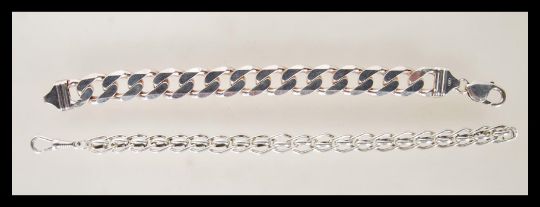 A stamped 925 silver flat link bracelet having a lobster clasp (measures 7 1/2 inches) along with another linked chain bracelet (measures 8 inches). Weight 62.3g.