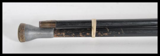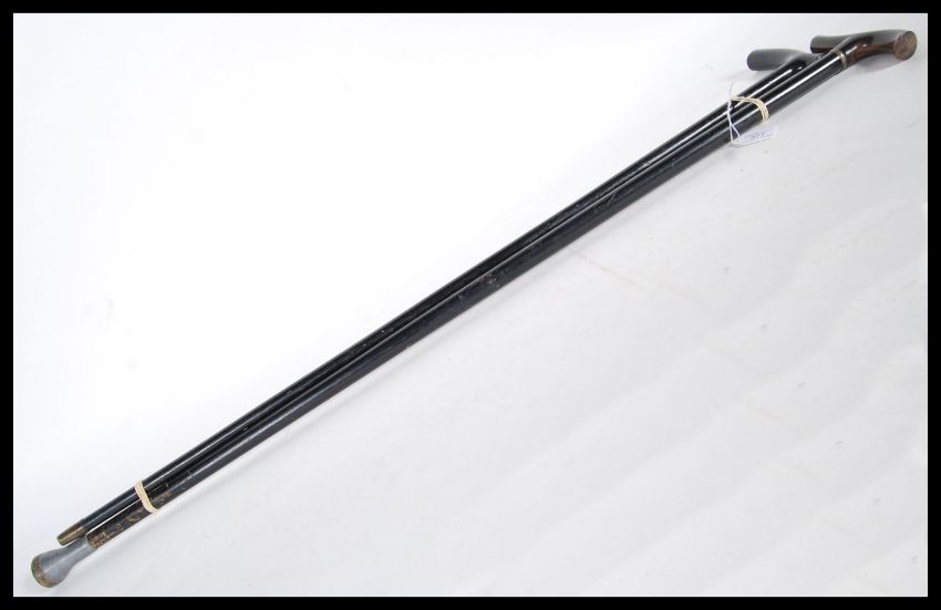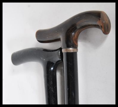 A pair of 20th Century crook handle walking sticks/ canes, having tapering ebony shafts, one having a silver coloured collar and the other with a brass ferrule.