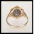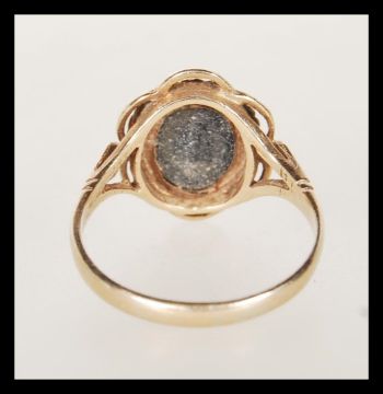 A hallmarked 9ct gold ladies dress ring set with a blue opalescent cabochon in a decorative setting. Hallmarked Birmingham 1973. Weight 2.9g. Size O.