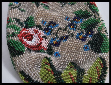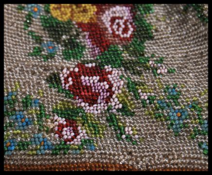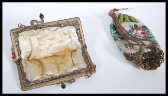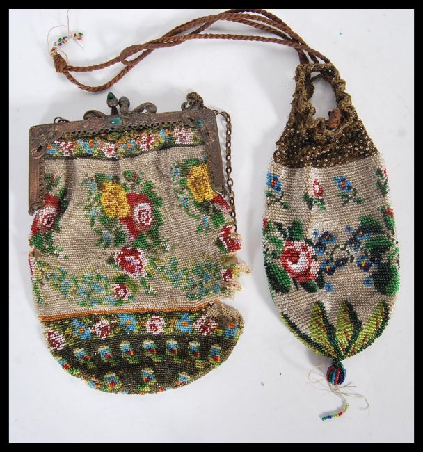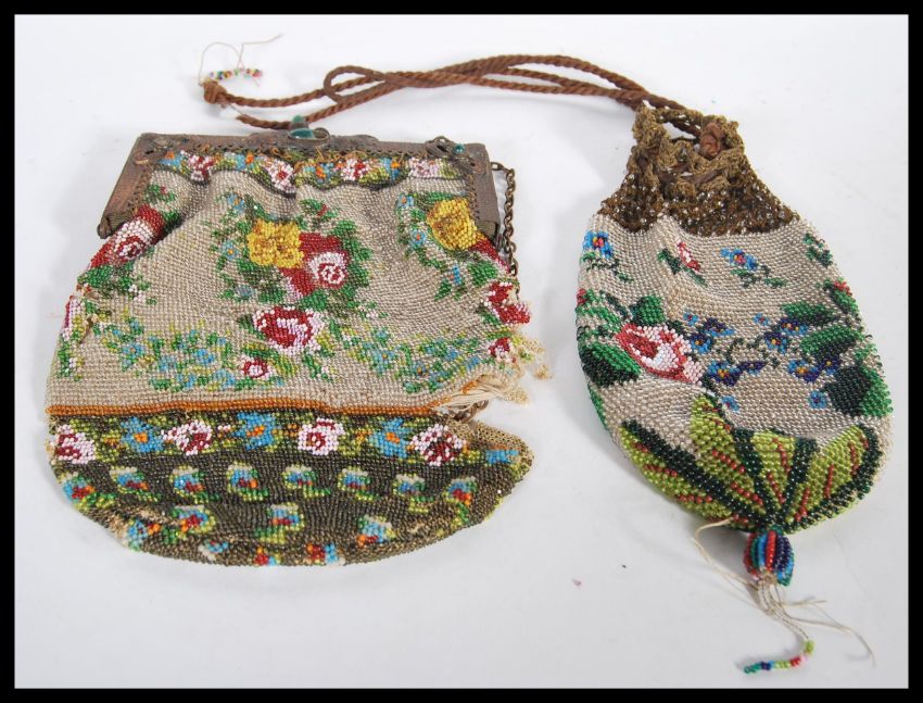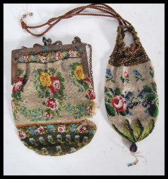 Two 19th Century Victorian beadwork purses, both having multi colour floral decoration. One having tasseled end and drawstring opening, the other on a metal hinge frame, decorated with green cabochon stones.Measures 20cm x 13cm.