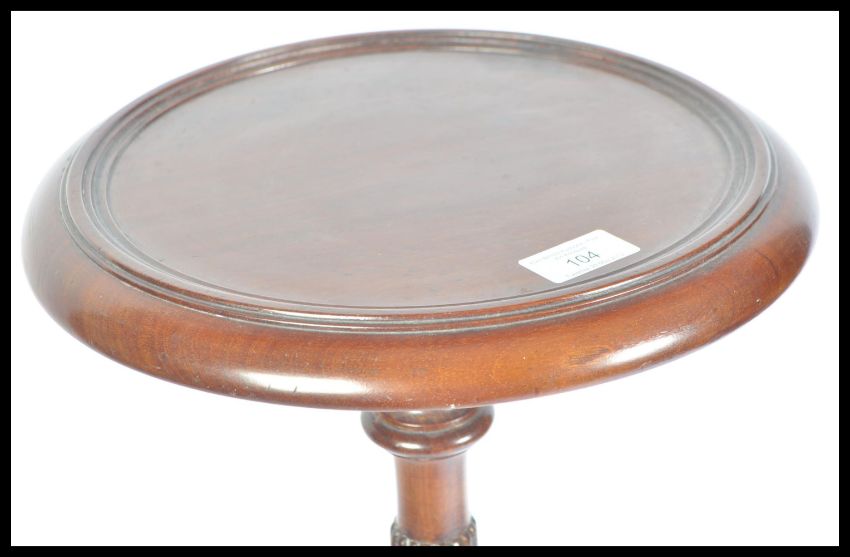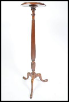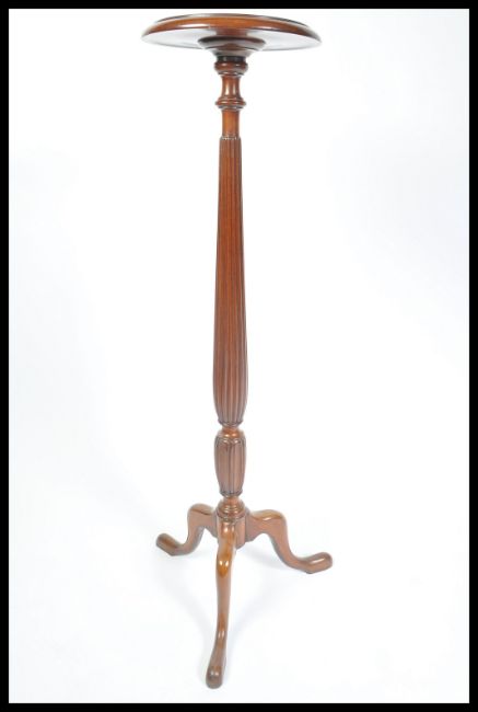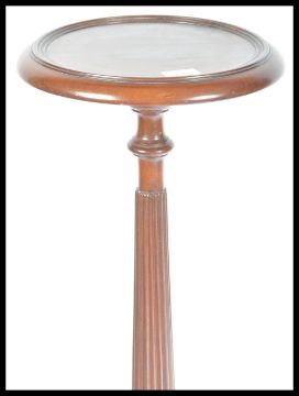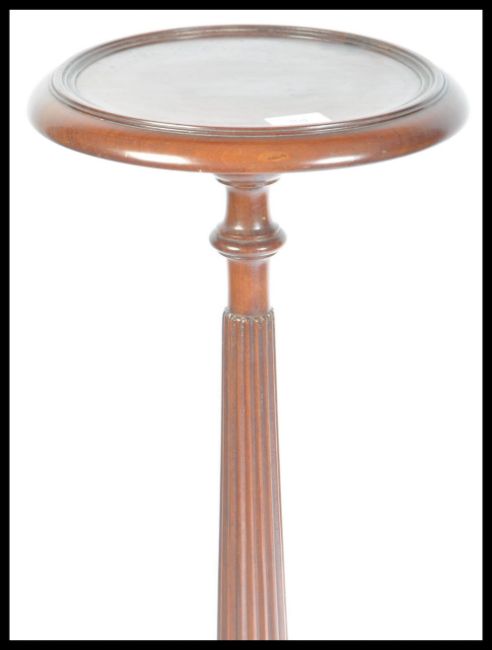 A good  19th century Victorian large mahogany reeded column torchere  / plant stand being raised on a splayed legs base with ball and claw feet, acanthus carved leaf shoulders and circular top above. Measures 122cms high
