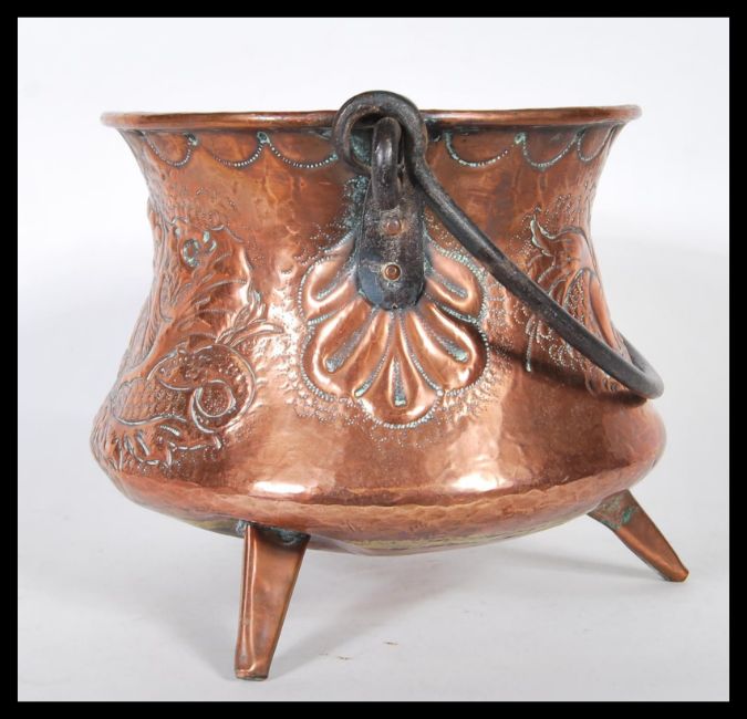 A 19th Century Victorian French hand worked copper chestnut pan, the pan in the form of a cauldron, tripod feet to the base with iron handle to top. French royal crest in relief to the front.Measures 20cm x 26cm.