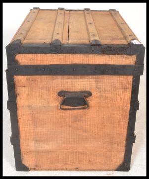 An early 20th Century pine iron bound trunk coffer chest box of square form having wrought iron drop handles to the side. Measures 115cm high x 75cm wide.
