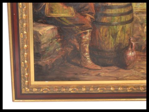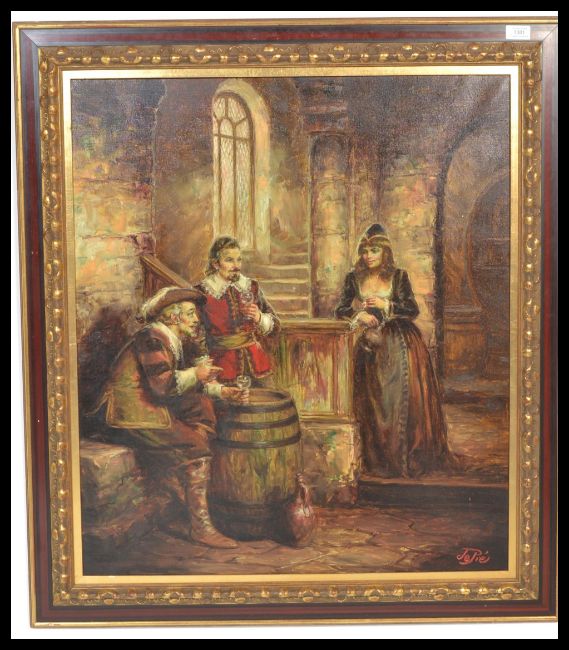 DePre - An oil on canvas painting , depicting three figures in 17th Century clothing drinking wine in a cellar, signed to corner and set within an ornate wooden carved frame. Measures 80cm x 68cm.