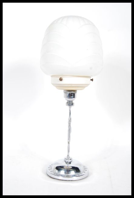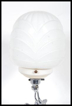 A 1930's Art Deco chrome table lamp in the form of a nude female recumbent figurine holding aloft a torch, finished with a milk glass shade.