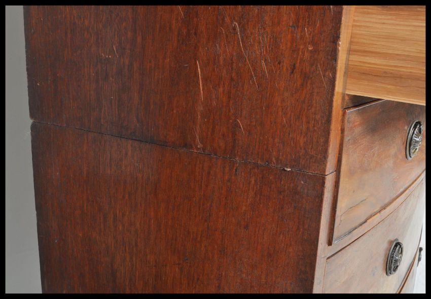 An early 19th Century Georgian mahogany bow front attic chest of drawers having inlay decorated top. The bank of two over four drawers having brass ring hoop handles and oval backplates. Splits into two for ease of transport. Measures 134 cm high x 110 cm wide x 57 cm deep.