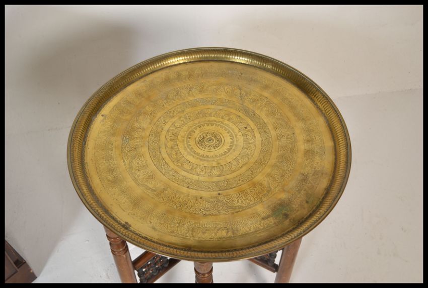 A reproduction Georgian style Regency revival chest of drawers, two over three drawers brass drop handles with backplates. Together with a 20th century brass charger folding Binaries occasional table. The brass tray of circular form having engraved decoration raised on a folding metamorphic stand. Measures 75cms high x 66cms wide x 38cms deep.