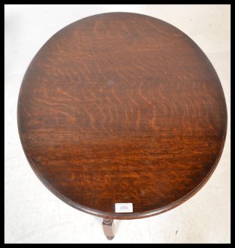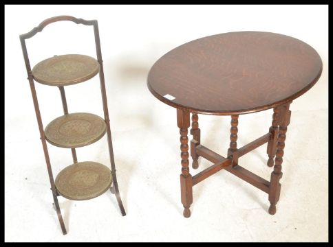 An early 20th Century Anglo-Persian - Islamic inspired three tier metamorphic oak framed cake stand, each tier constructed from hand worked copper together with an oak metamorphic folding occasional table raised on bobbin supports.  Measures 63cm high x 73cm wide x 58cm depth.
