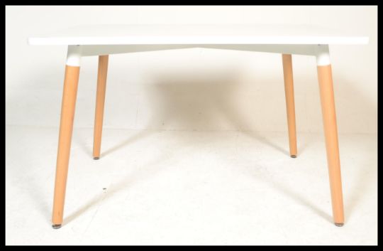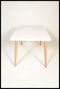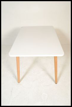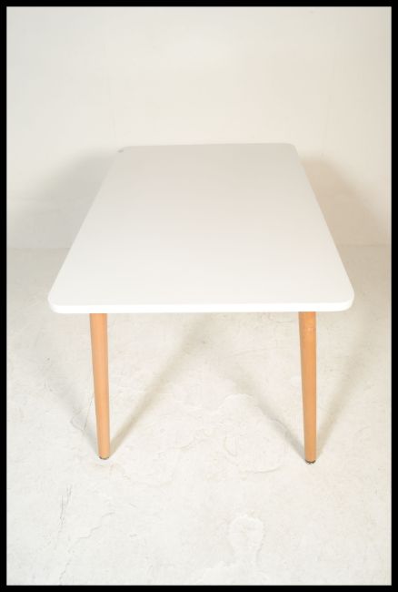 A contemporary white laminated and ash dining table. The table comprising of a laminated wooden table top with metal brace and round tapering ash wood legs. Measures 74 cm high, 130 cm wide and 80 cm deep.