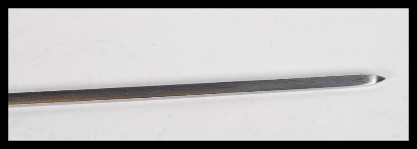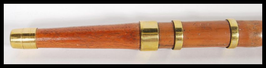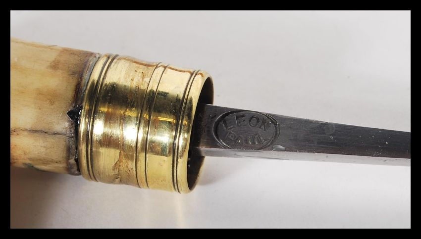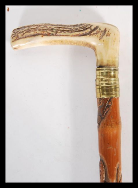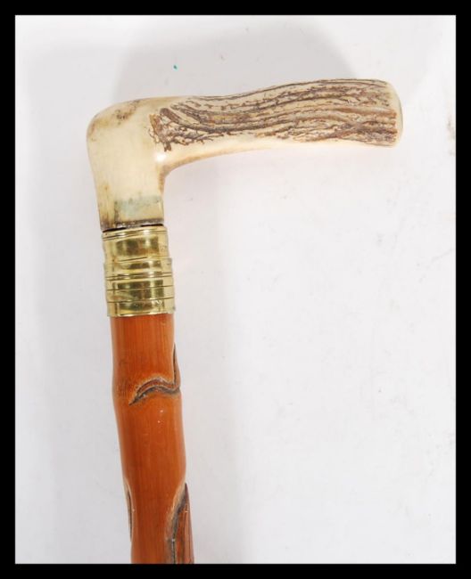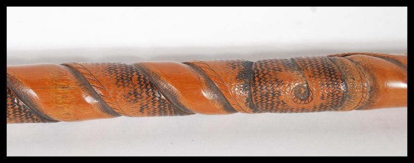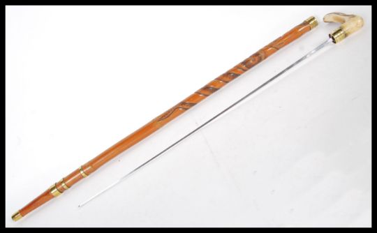 A 20th Century walking sword stick cane having bone crook handle with with brass banding. Handle pulls off to reveal a sword / dagger. On a craved tapering shaft, decorated with a snake chasing a mouse. Brass ferrule.