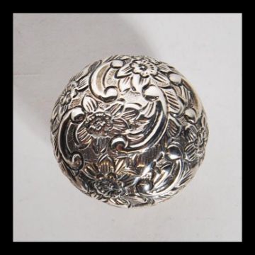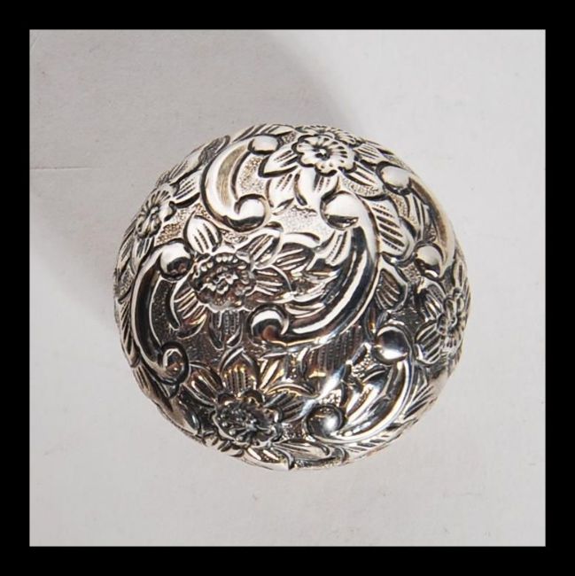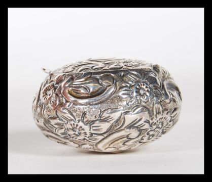 An early 20th Century silver hallmarked snuff / pill box of bulbous form having repousse floral decoration with an unmarked cartouche panel to the hinged lid. Hallmarked with date letter G. Weight 18.2g.