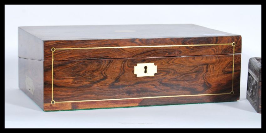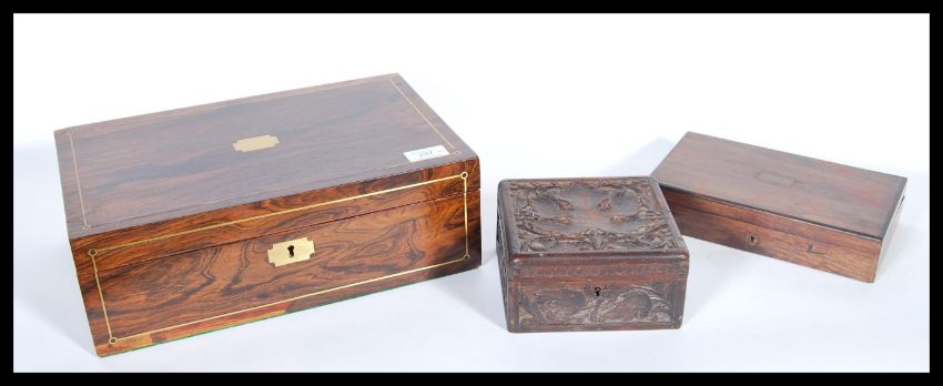 A selection of wooden boxes to include a 19th Century writing slope box having inlaid borders with a brass escutcheon to the front, a carved wood treen box having floral decoration and a geometry toolbox with a fitted red velvet interior.Measures 12cm x 36cm x 23cm.