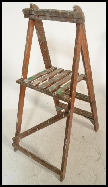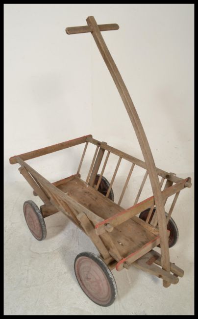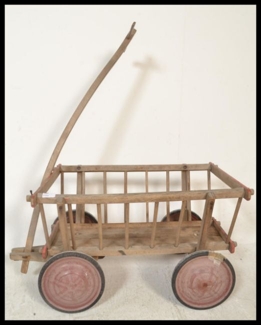 A continental believed 19th century pine children's hay cart. Original wheels with slatted angular trailer complete with pull handle. Measures 95cm high x 54cm wide x 80cm deep. Together with a vintage wooden industrial step ladder