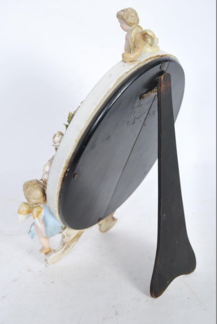 A 19th Century style porcelain easel back mirror, oval form, florally encrusted with lappet and polychrome egg borders, surmounted by a putti holding garlands in the manner of Meissen / Sitzendorf.