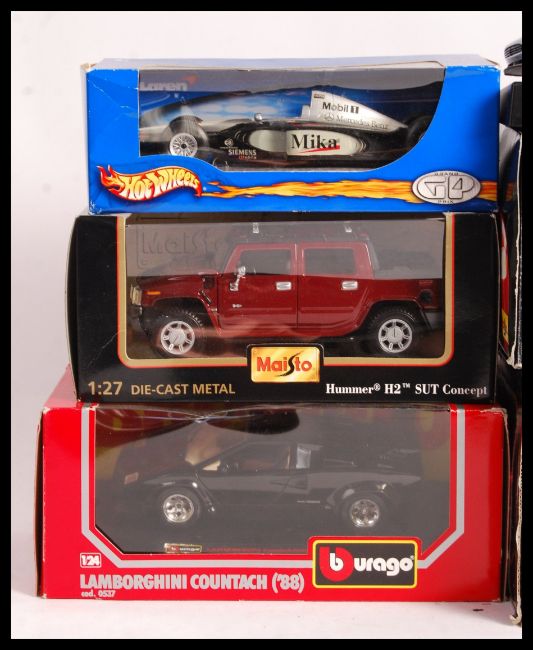 A collection of 6x assorted scale diecast model vehicles to include; 1:18 Bburago Dodge Viper, 1:18 Maisto Mustang Mach III, 1:24 Bburago Lamborghini Countach ('88), 1:27 Hummer H2 SUT Concept, 1:24 Hot Wheels Mercedes-Benz and a loose 1::18 Jaguar XJ220.