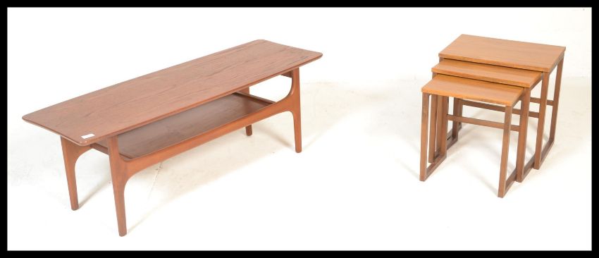 A retro 20th Century teak wood coffee table, surfboard shaped top raised on tapering supports united by under tier magazine rack together with a retro teak nest of graduating three nest of tables.