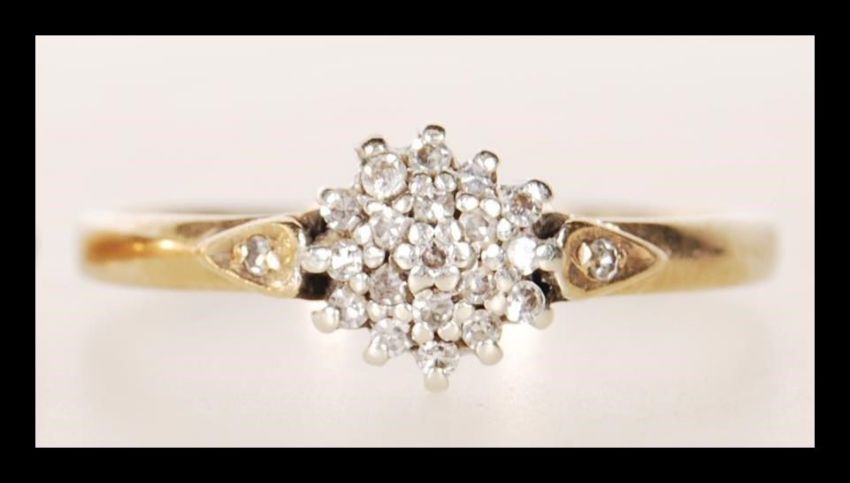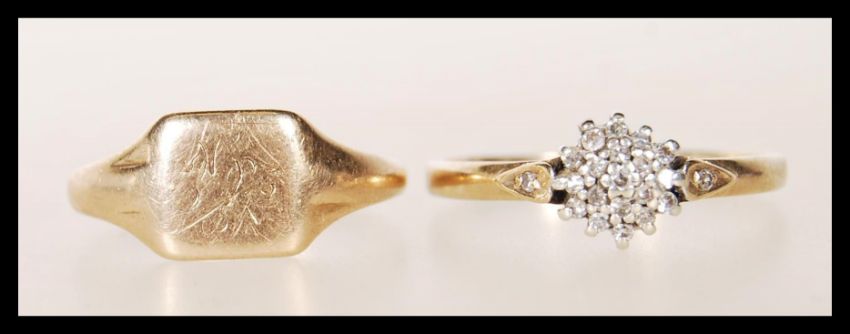 Two hallmarked 9ct gold rings to include a signet ring having a square cartouche head (hallmarked Chester 1957, size P) and an Art Deco style cluster ring set with white stones (hallmarked London 1990, size U). Gross weight 3.9g.