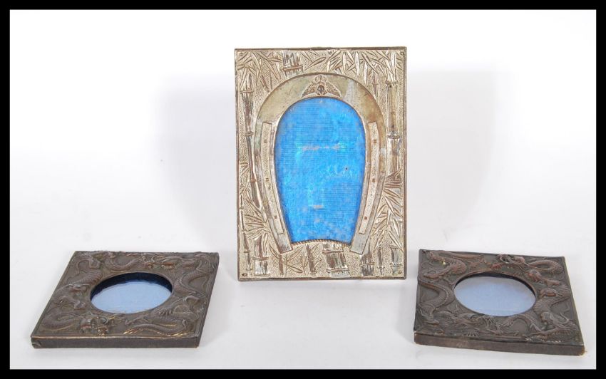 A group of three 20th Century Chinese photo frames to include two cast metal fronted Chinese dragon frames along with a rectangular frame with repousse horse shoe and bamboo design.