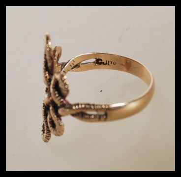 A 1970's hallmarked 9ct gold ring having a knot design head. Hallmarked London 1972. Weight 3.5g.