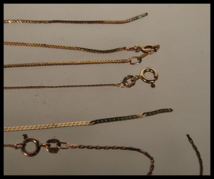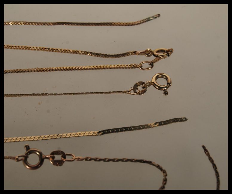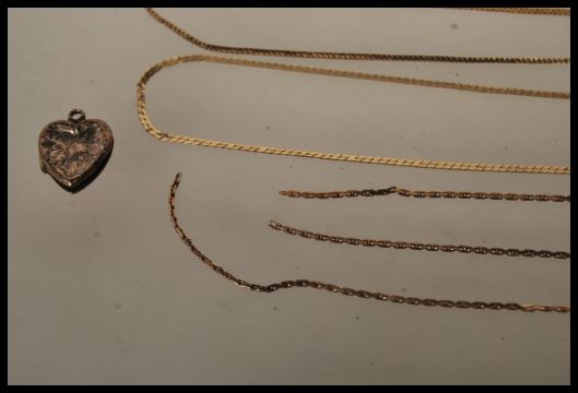A collection of 9ct gold jewellery to include three fine necklace chains along with a heart shaped locket with engraved decoration. As Found. Weight 7.8g.