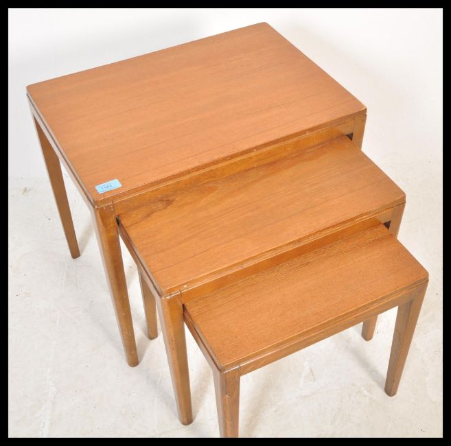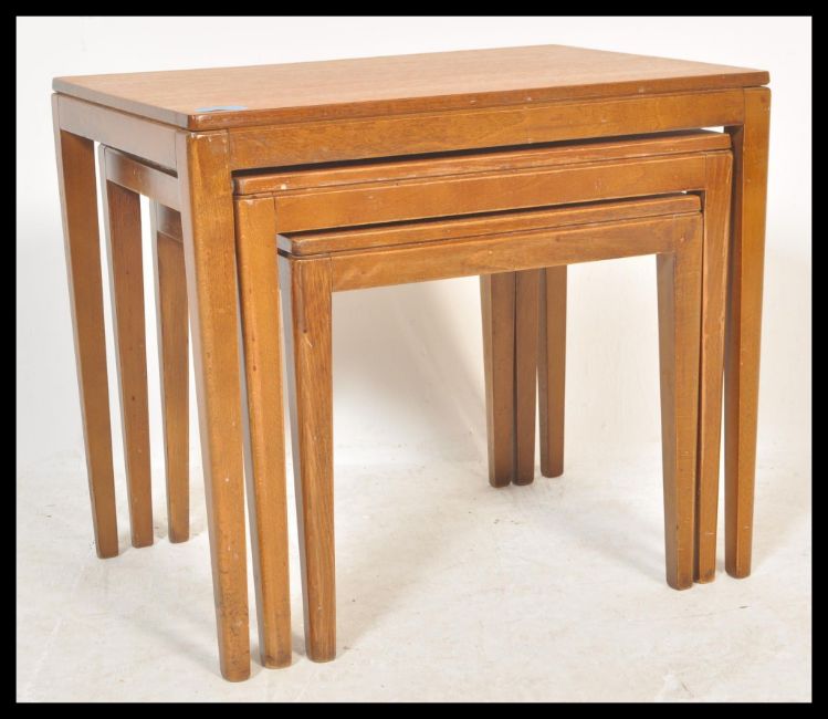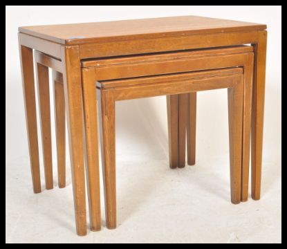 A vintage retro 20th Century teak wood nest of three tables raised on rounded tapering legs. Measures 46 cm high x 53 cm wide x 38 cm deep.