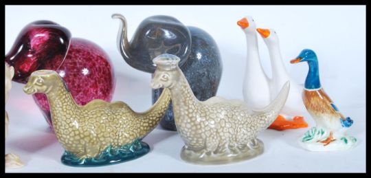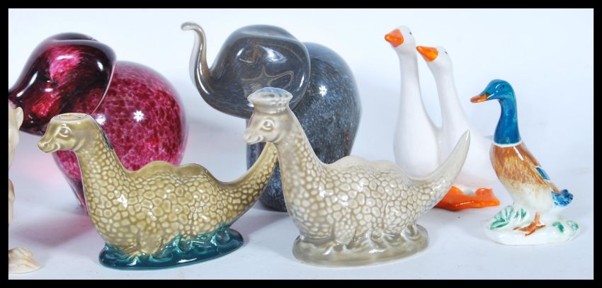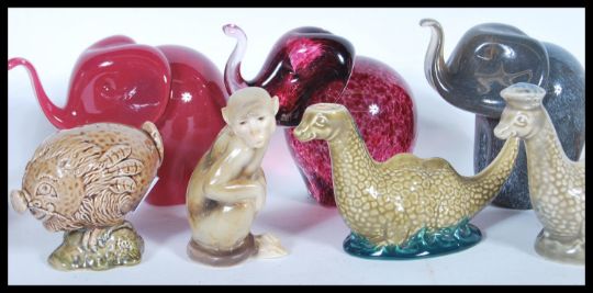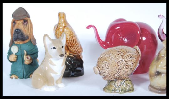 A collection of Beswick Small Whisky Decanters comprising Loch Ness Monster x 2, Flying Haggis together with two Langham studio pottery glass paperweights modelled as elephants, a Wedgwood glass paperweight aso modelled as an elephant etc.