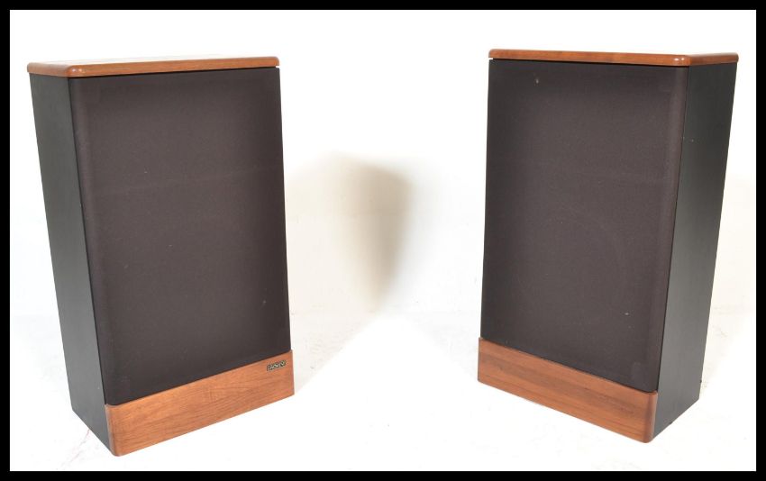 A pair of 20th Century Advent Legacy II floor standing audio speakers the speakers within elm cases.