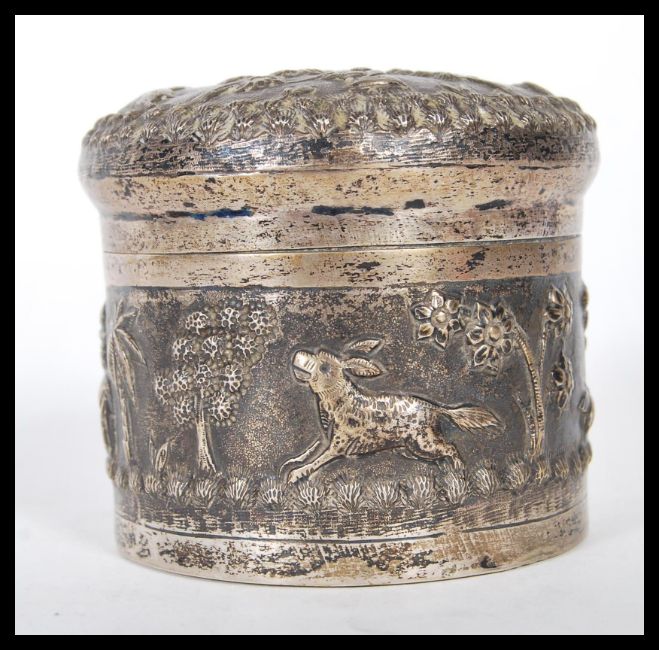A 20th Century Anglo Indian silver white metal lidded jar decorated with hunting scenes in repousse to the sides depicting a man hunting for a two animals having a domed lid to the top with further decoration, possibly Lucknow.Measures 7cm wide.