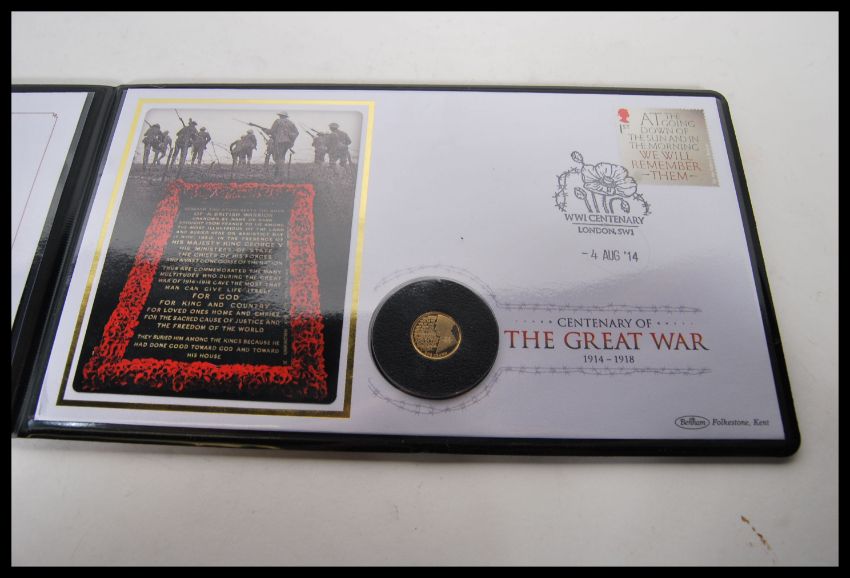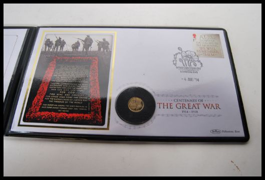 A Jubilee Mint limited edition cased The Centenary of World War I solid gold coin cover, comprising of commemorative design envelope, stamp and 9ct gold coin with certificate. Limited edition number 299.