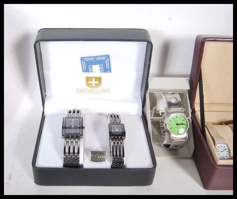 A collection of 20th Century watches and watch boxes to include, boxed his and hers Swiss line watches, Xanadu on a leather strap, two display boxes having Avia, 3x USA army brand, Nike, Talis 21 jewels automatic and more. On display box having carrying handle.