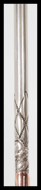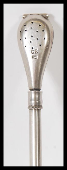 A stamped 800 silver mate drinking straw, the mouth piece stamped 18ct gold having embossed decoration to the straw including floral emblems. Weight 29g.