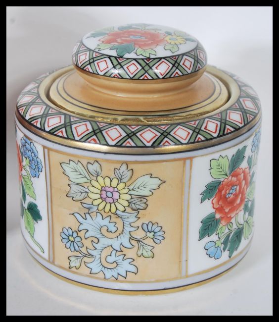 A collection of 20th Century tobacco jars and lids to include a luster floral design marks M Z Austria to base, a PL Limoges France jar having red ground with gilt and floral decoration, a hand painted floral and geometric pattern jar by Nippon Noritake and two having old english scenes, stamped Royal Winton Grimwades to base.